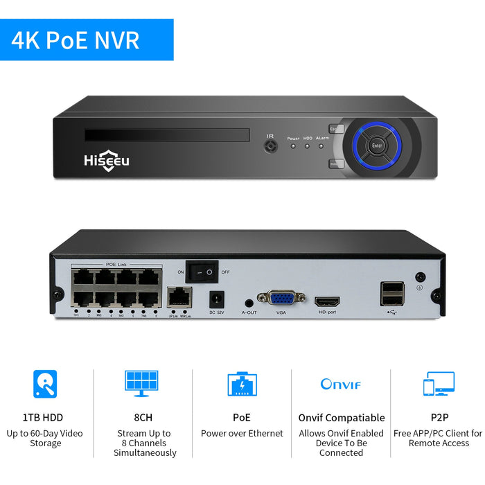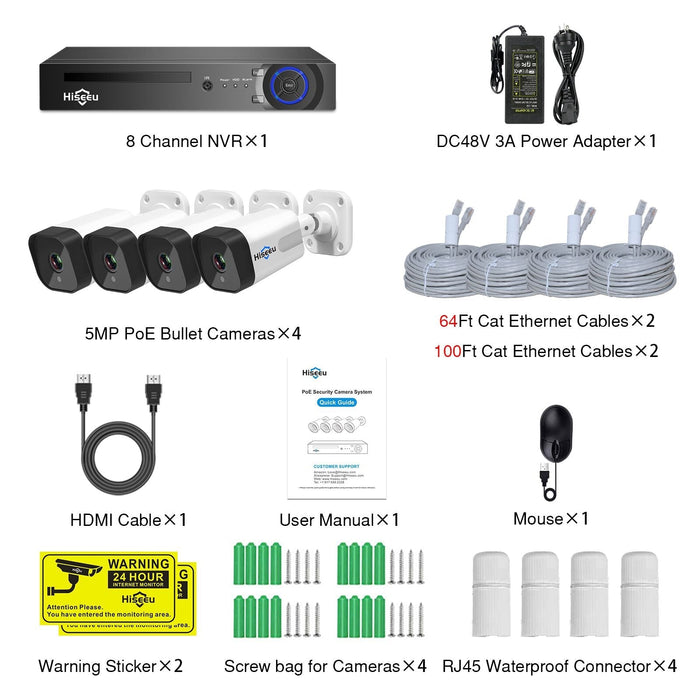 Hiseeu 8CH 5MP NVR Camera System - 4Pcs POE H.265+ IP Security Cameras, Audio, Night Vision 10m, IP66 Waterproof, Onvif - Ideal for Home and Business Security