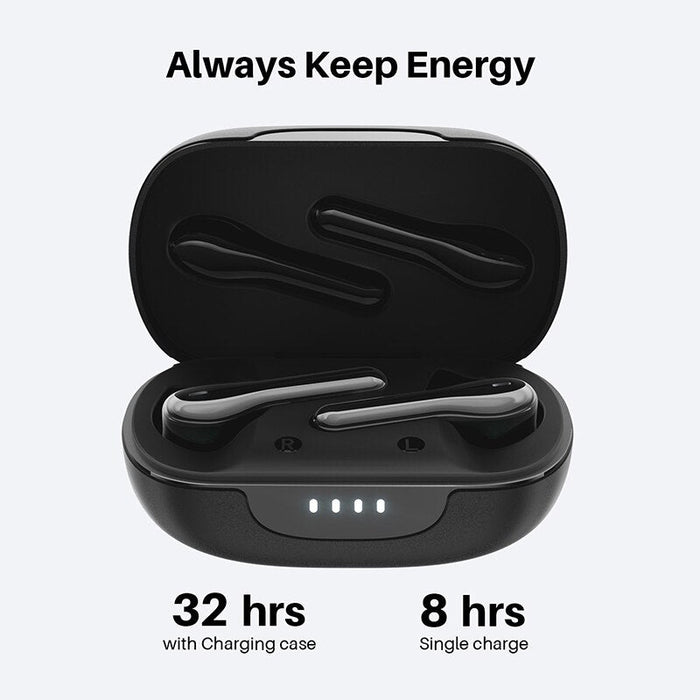 • Meghosszabbított akkumulátor és érintőgomb: Töltésenként 8 óra zenelejátszási idő a bluetooth fülhallgatóhoz, a vezeték nélküli fejhallgató töltőtokkal pedig összesen 32 óra.