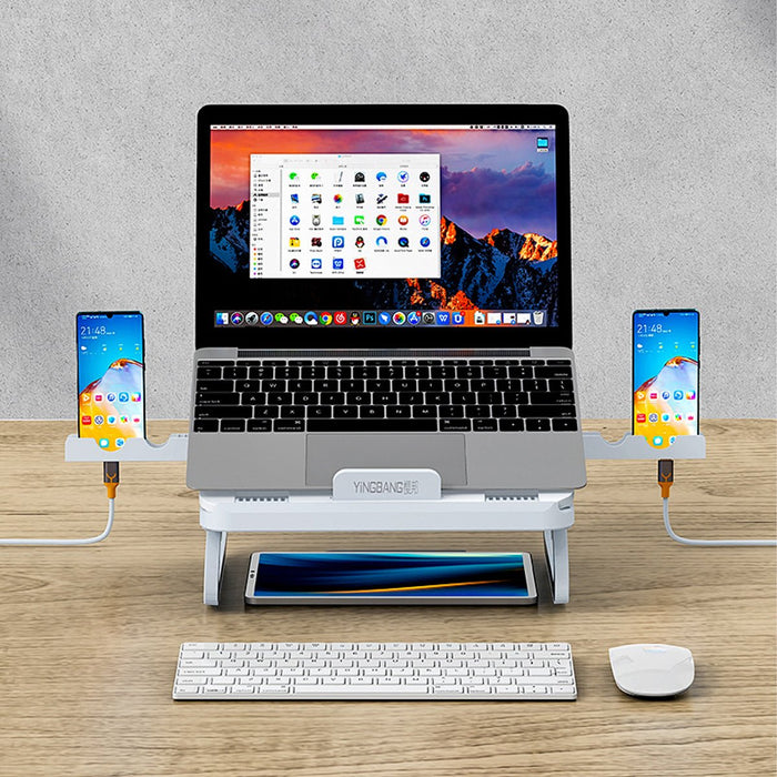 Laptop állványunk minden igényt kielégít. 4 USB 3.0 porttal és USB tápegységgel rendelkezik, hogy készülékei teljesen feltöltve maradjanak. Az állvány magasságát tíz különböző szintre állíthatja be, hogy elérje a kívánt szöget és magasságot, így sokféle igényt kielégít.